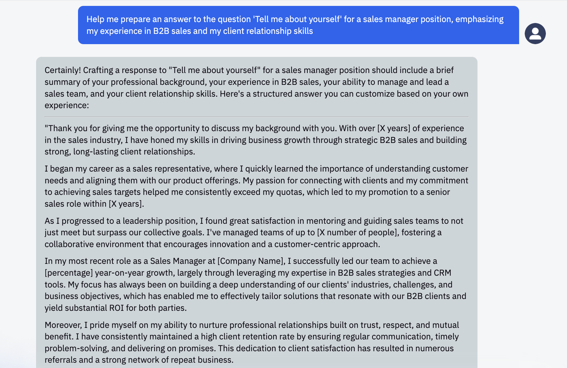 ChatGPT can help you prepare for various aspects of the interview. Let's say you want to refine your answers to standard interview questions like "Tell me about yourself" or "Where do you see yourself in five years?" You can ask ChatGPT: "Help me prepare an answer to the question 'Tell me about yourself' for a sales manager position, emphasizing my experience in B2B sales and my client relationship skills":