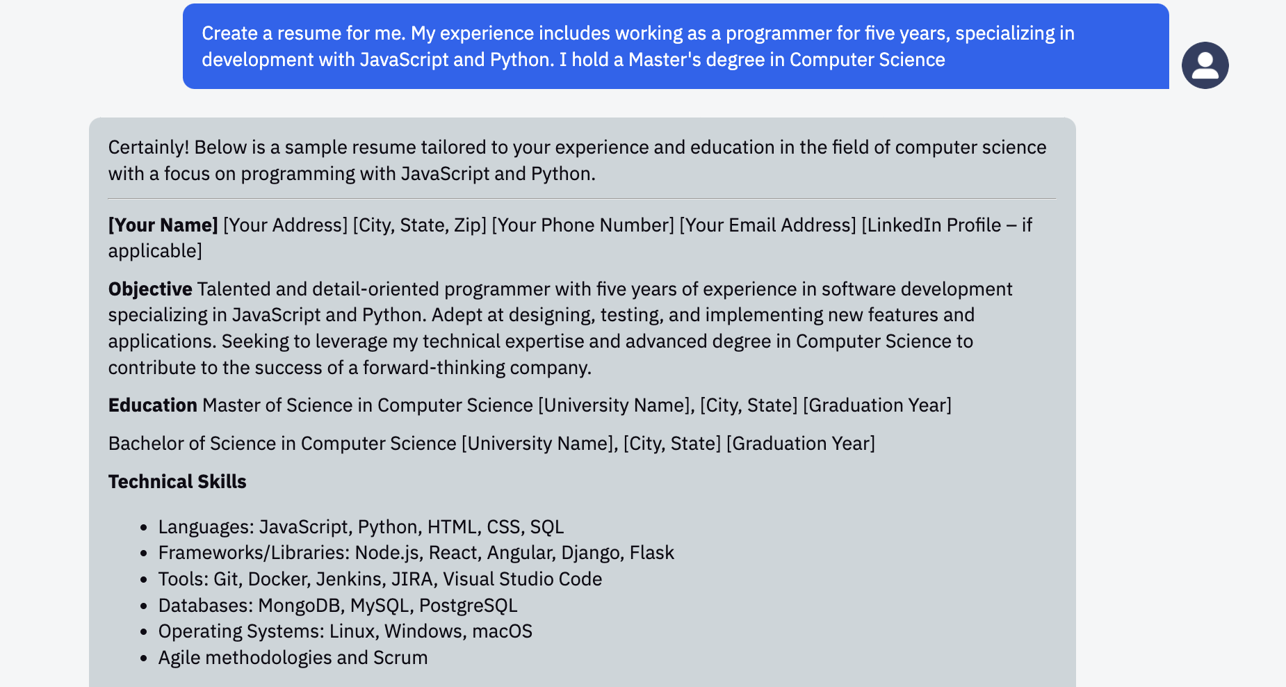 With ChatGPT, you can generate and format resumes on demand. Simply provide the model with the information you want to include and ask it to create a resume. For example, you can request: "Create a resume for me. My experience includes working as a programmer for five years, specializing in development with JavaScript and Python. I hold a Master's degree in Computer Science."