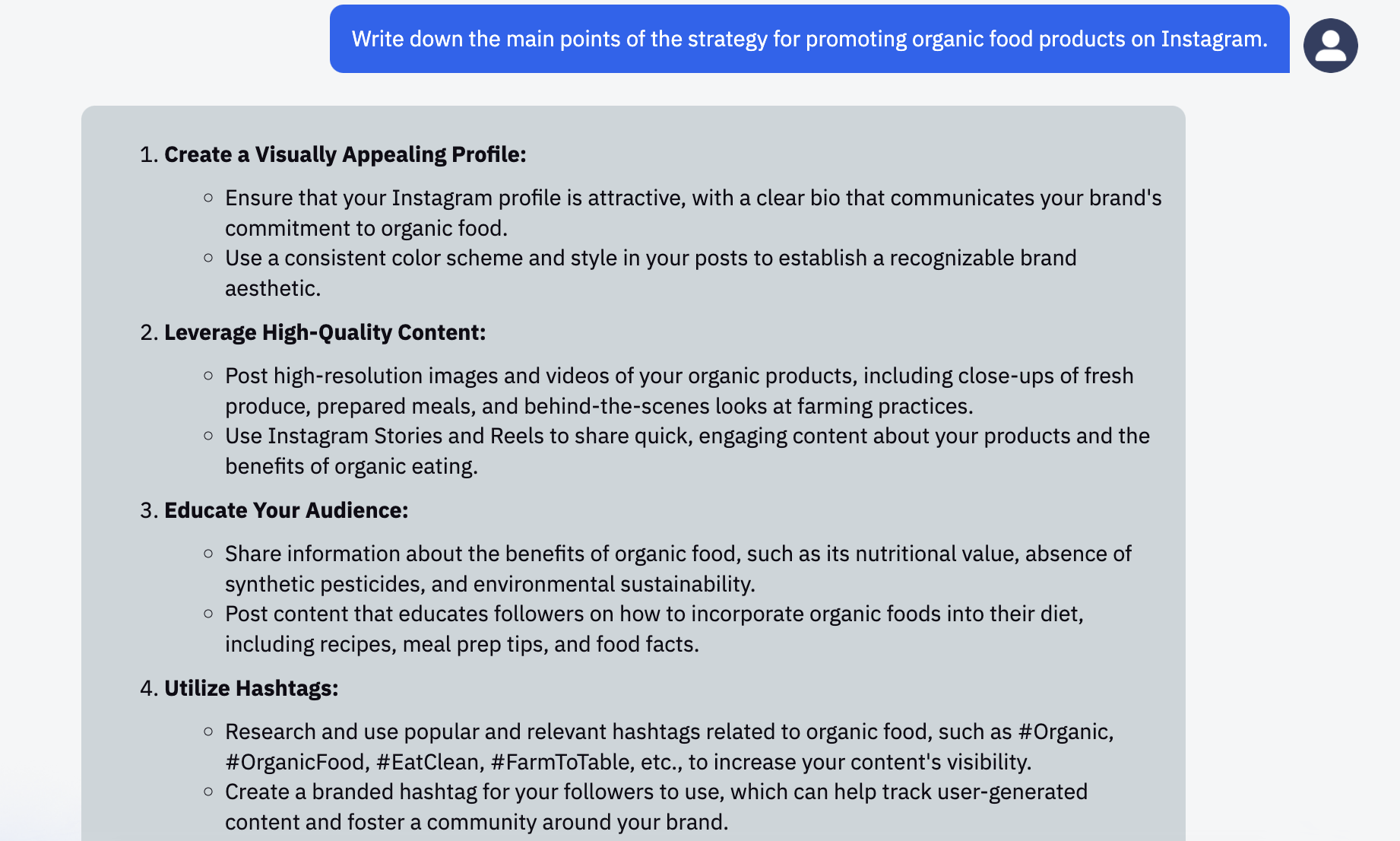For example, you can give it the following task: "Write down the main points of the strategy for promoting organic food products on Instagram."