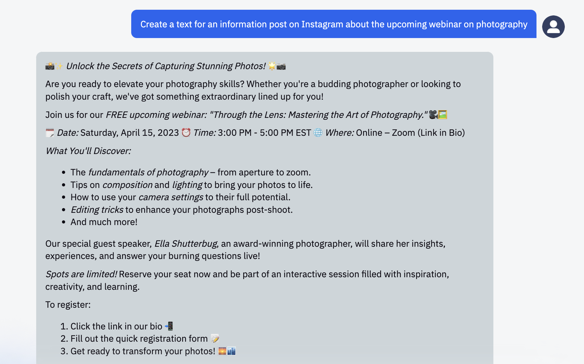 Request: “Create a text for an information post on Instagram about the upcoming webinar on photography”