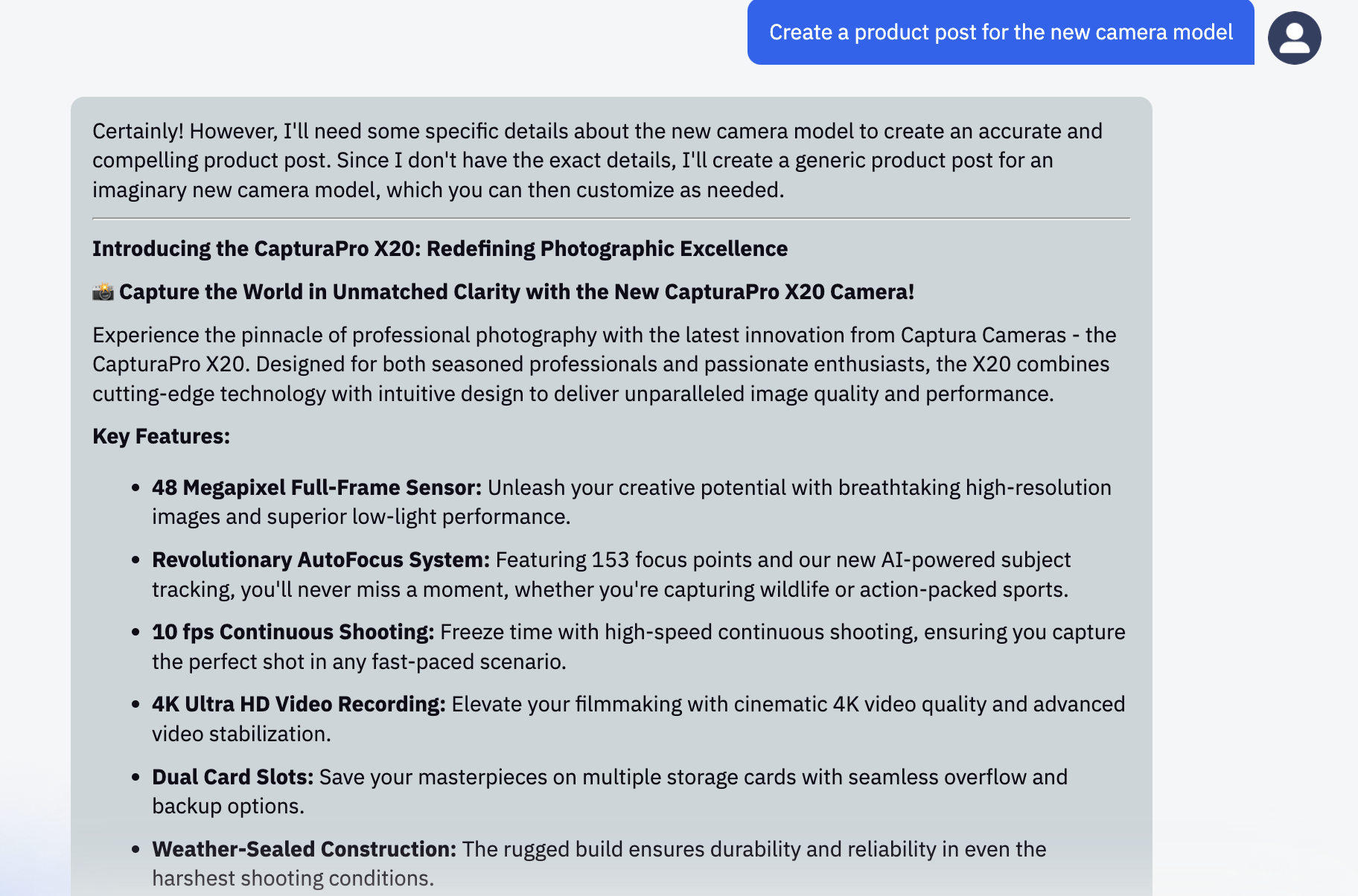 Request: "Create a product post for the new camera model"