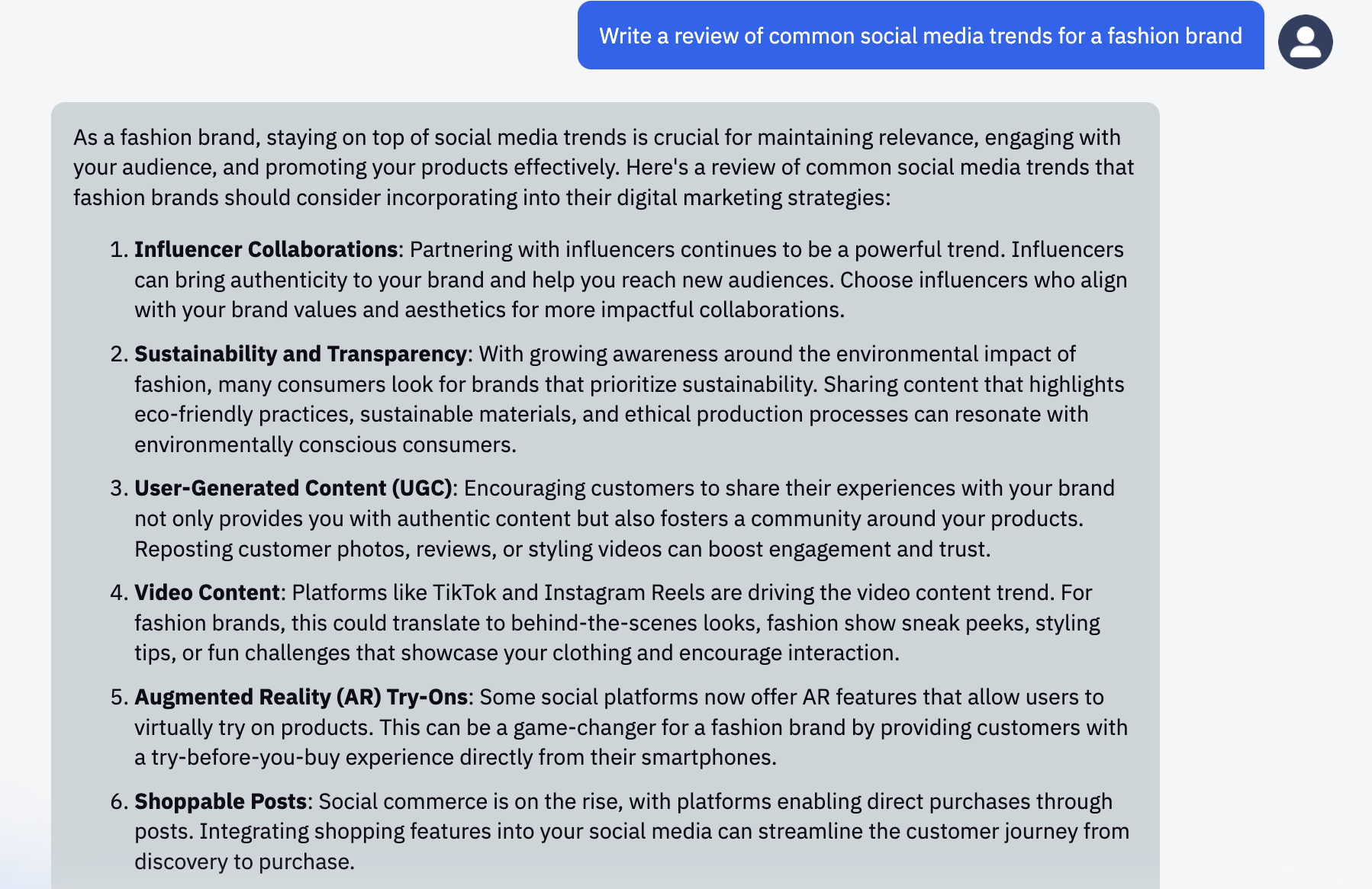An example request could be: "Write a review of common social media trends for a fashion brand."