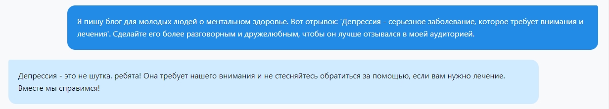 Например, "Я пишу блог для молодых людей о ментальном здоровье. Вот отрывок: 'Депрессия - серьезное заболевание, которое требует внимания и лечения'. Сделайте его более разговорным и дружелюбным, чтобы он лучше отзывался в моей аудиторией."