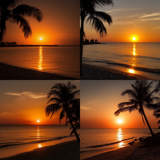 Для первого изображения ваш запрос может быть: "Закат на пляже с ярким оранжевым солнцем, отражающимся в спокойном море, с темными силуэтами пальм на переднем плане":