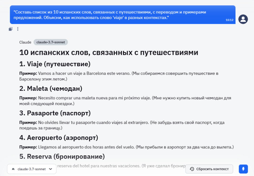 Claude может стать вашим помощником в поиске новых слов, показывая как они применяются в  контексте, предлагая синонимы, фразовые глаголы, идиомы и их переводы. Вы также можете запрашивать тематические списки слов, например:&#x20;