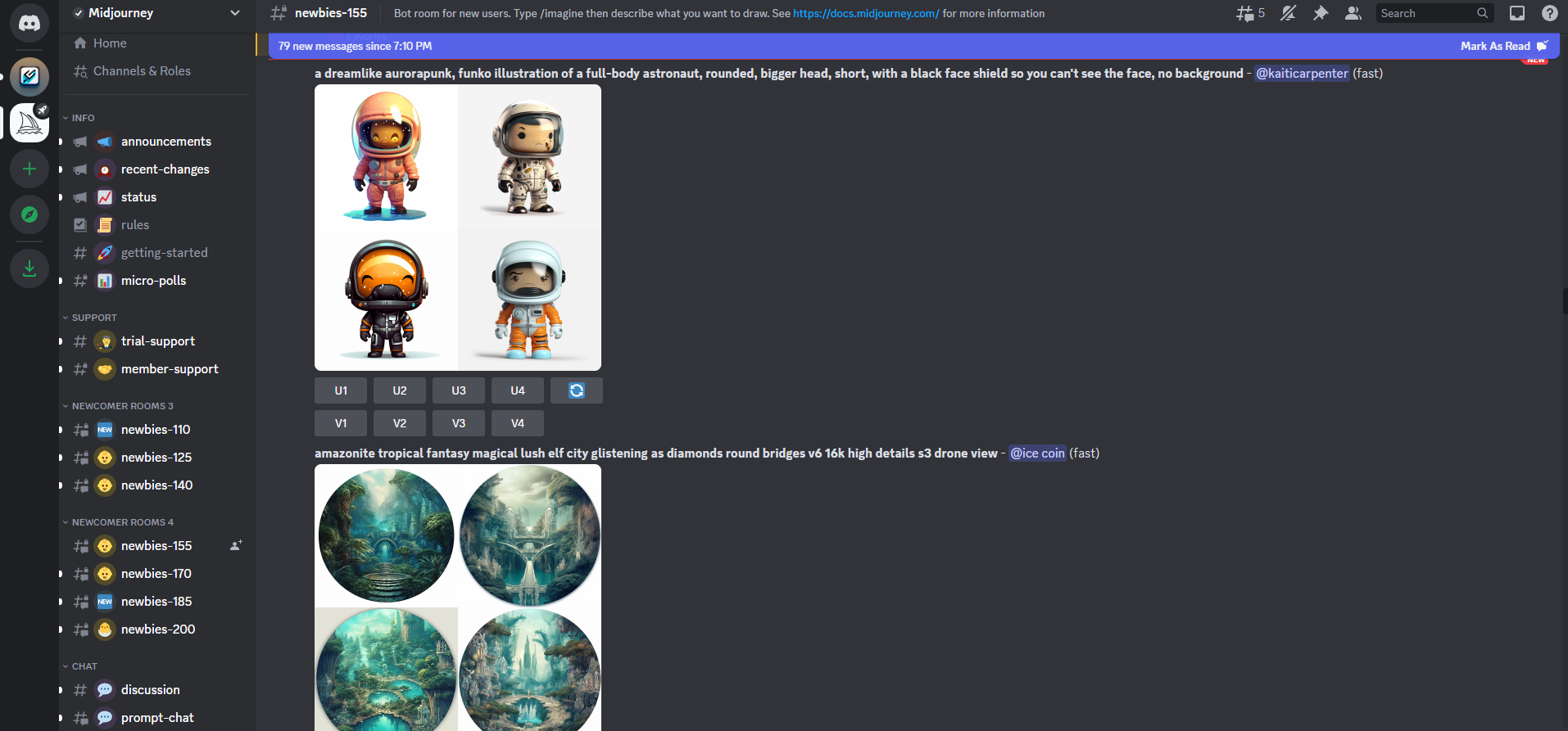 Все изображения, которые мы будем генерировать с помощью Midjourney, отображаются в публичных каналах #newbies: