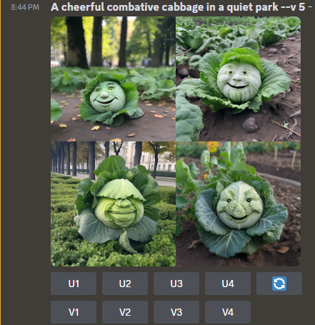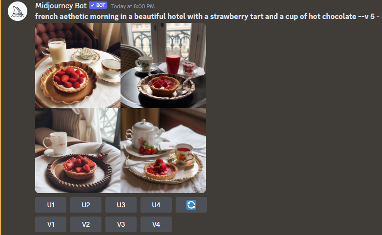 Midjourney начнет генерировать четыре варианта нашего изображения в течение минуты.
