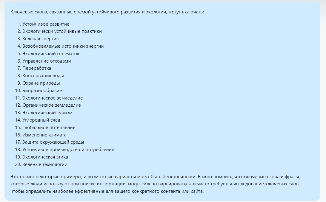 Используйте ChatGPT, чтобы сгенерировать список ключевых слов и фраз, которые потенциально могут быть использованы для этой темы. Помните, что хорошие ключевые слова могут быть не только очевидными (например, "экология"), но и специфичными для вашей аудитории или ниши.