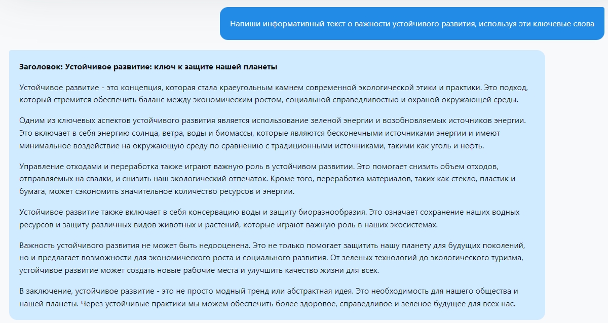 Запрос 2: "Напиши информативный текст о важности устойчивого развития, используя эти ключевые слова."