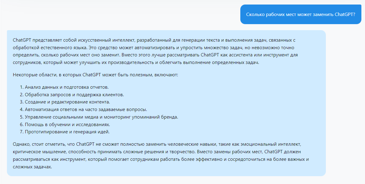 Что касается вопроса о замене рабочих мест, то по мнению самого ChatGPT, он не забирает рабочие места, потому что не выполняет работы, которую делают люди.