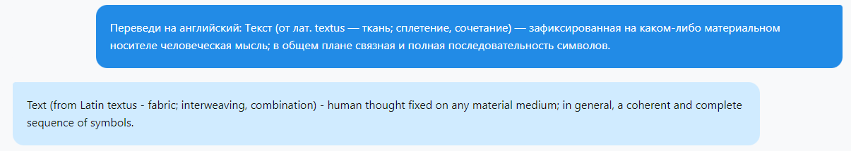Вот простейший пример того, как можно использовать ChatGPT для перевода: "Переведи на английский: Текст (от лат. textus — ткань; сплетение, сочетание) — зафиксированная на каком-либо материальном носителе человеческая мысль; в общем плане связная и полная последовательность символов."