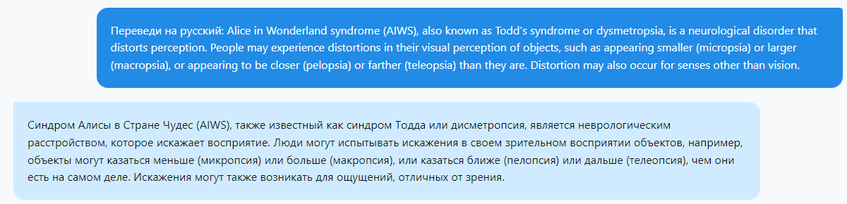 Английский: “Alice in Wonderland syndrome (AIWS), also known as Todd's syndrome or dysmetropsia, is a neurological disorder that distorts perception. People may experience distortions in their visual perception of objects, such as appearing smaller (micropsia) or larger (macropsia), or appearing to be closer (pelopsia) or farther (teleopsia) than they are. Distortion may also occur for senses other than vision.”