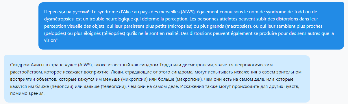 Французский: “Le syndrome d'Alice au pays des merveilles (AIWS), également connu sous le nom de syndrome de Todd ou de dysmétropsies, est un trouble neurologique qui déforme la perception. Les personnes atteintes peuvent subir des distorsions dans leur perception visuelle des objets, qui leur paraissent plus petits (micropsies) ou plus grands (macropsies), ou qui leur semblent plus proches (pelopsies) ou plus éloignés (téléopsies) qu'ils ne le sont en réalité. Des distorsions peuvent également se produire pour des sens autres que la vision.”