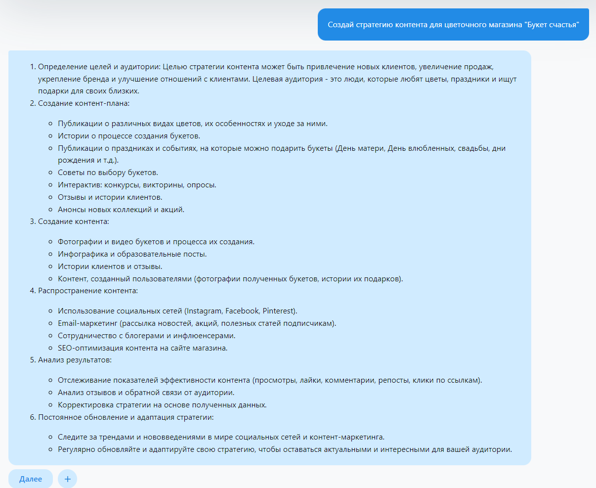 "Создай стратегию контента для цветочного магазина "Букет счастья""