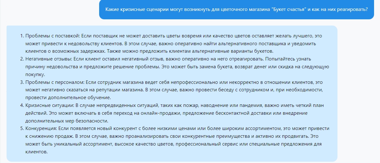 "Какие кризисные сценарии могут возникнуть для цветочного магазина "Букет счастья" и как на них реагировать?"