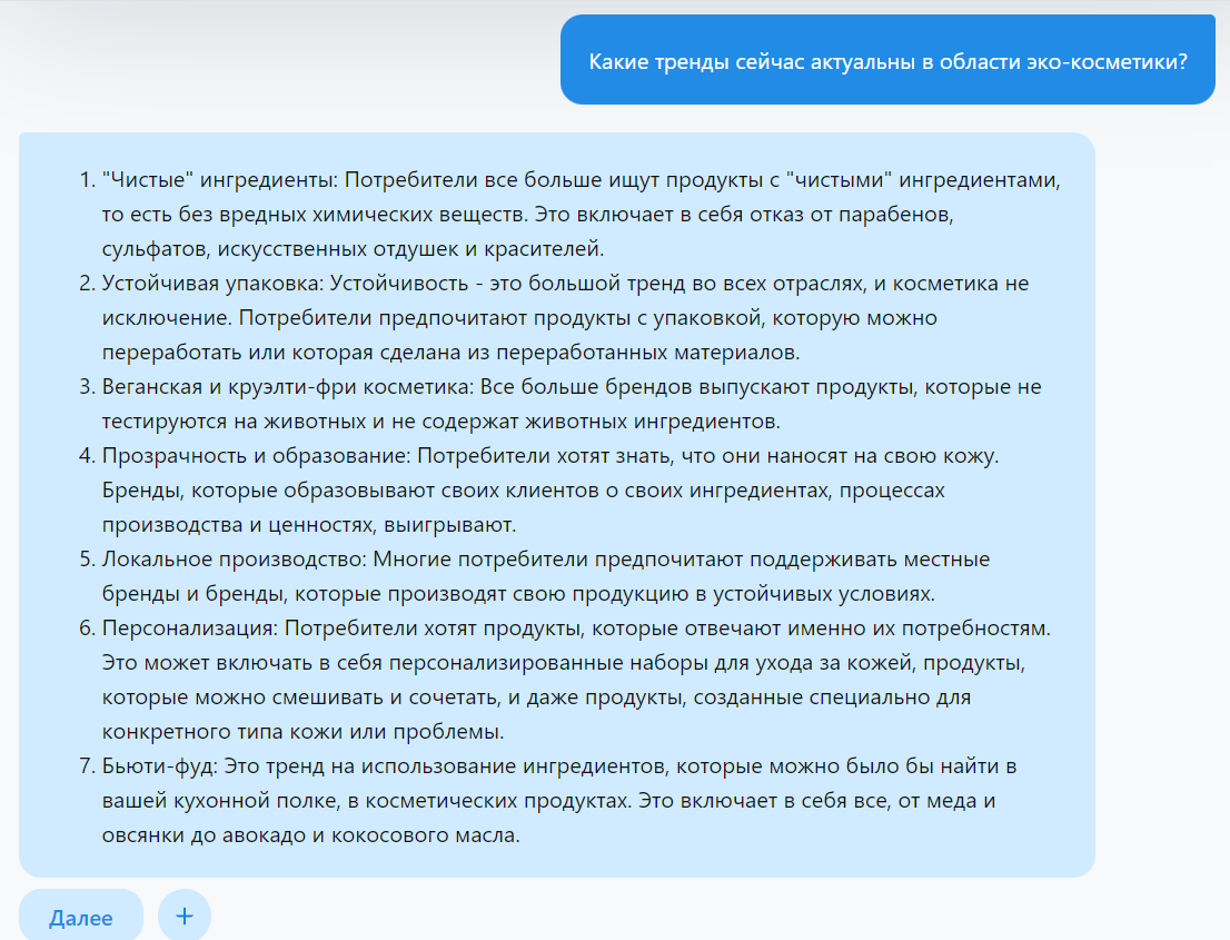 Исследование трендов: Чтобы создавать актуальный контент, важно быть в курсе последних трендов в вашей области. Вы можете попросить ChatGPT исследовать тренды, связанные с вашей нишей: "Какие тренды сейчас актуальны в области эко-косметики?".