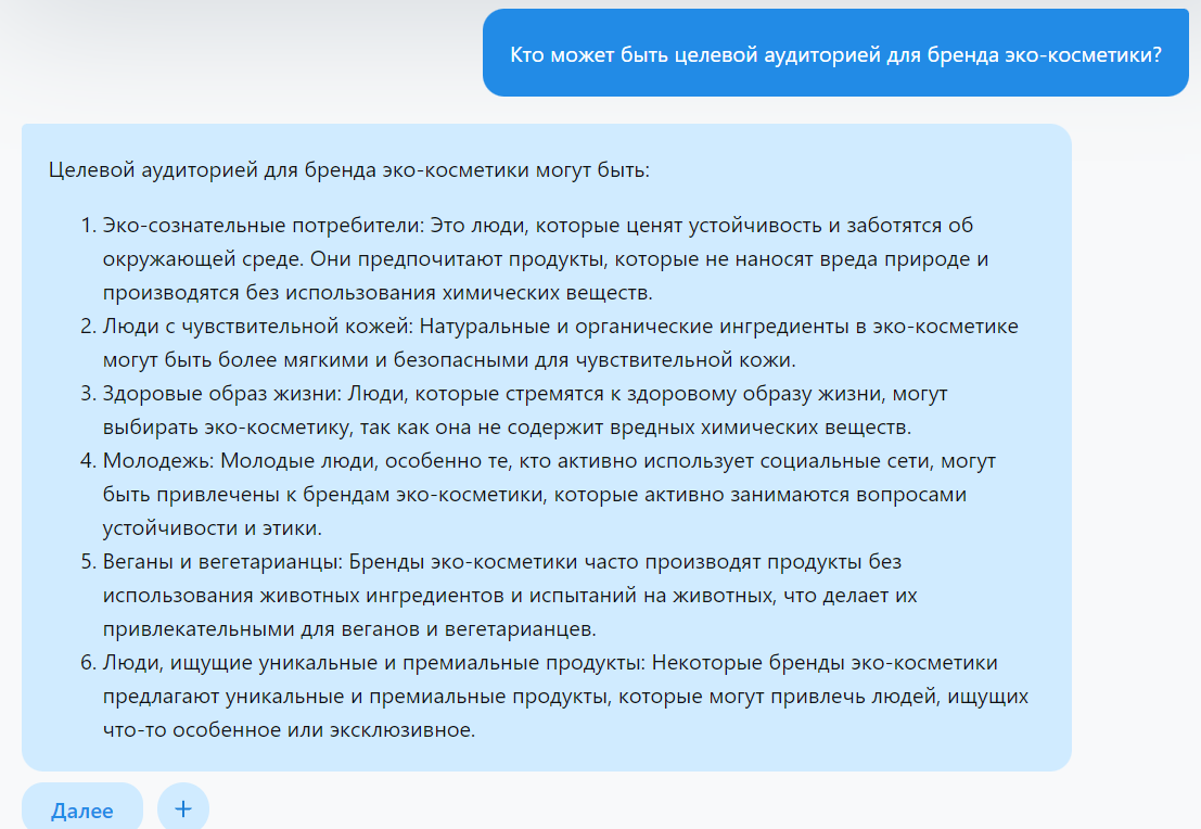 Определение аудитории: Ваша аудитория - это люди, которые вы хотите привлечь и вовлечь своим контентом. Они могут быть определены по различным критериям, включая возраст, пол, местоположение, интересы, и так далее. С помощью ChatGPT вы можете определить свою целевую аудиторию: "Кто может быть целевой аудиторией для бренда эко-косметики?".