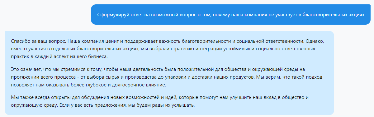 ChatGPT может помочь вам подготовиться к потенциальным кризисам, создав примеры ответов на различные сложные вопросы или комментарии. Это поможет вам заранее подумать о подходящих стратегиях реагирования и действовать более уверенно в реальной ситуации. Например, "Сформулируй ответ на возможный вопрос о том, почему наша компания не участвует в благотворительных акциях":