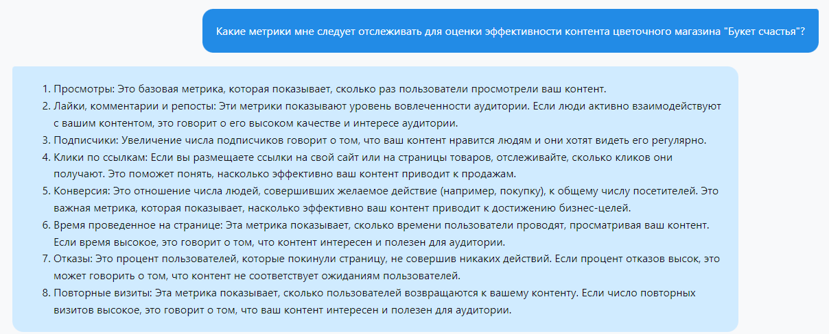 Попросите ChatGPT дать вам общую идею о том, какие метрики и показатели следует отслеживать для оценки эффективности вашего контента.