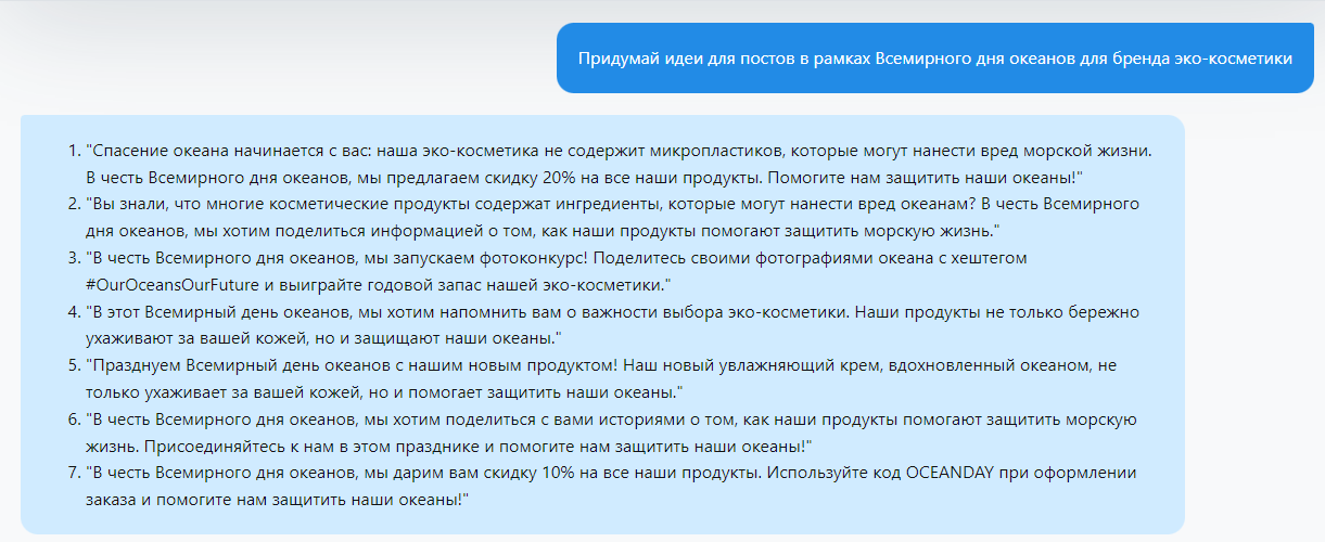 Создание идей на основе тематических дней или событий: Ваш контент может быть связан с определенными датами или событиями, например, с международными днями, праздниками или сезонными событиями. Спросите у ChatGPT идеи для постов на основе предстоящих событий: "Придумай идеи для постов в рамках Всемирного дня океанов для бренда эко-косметики":
