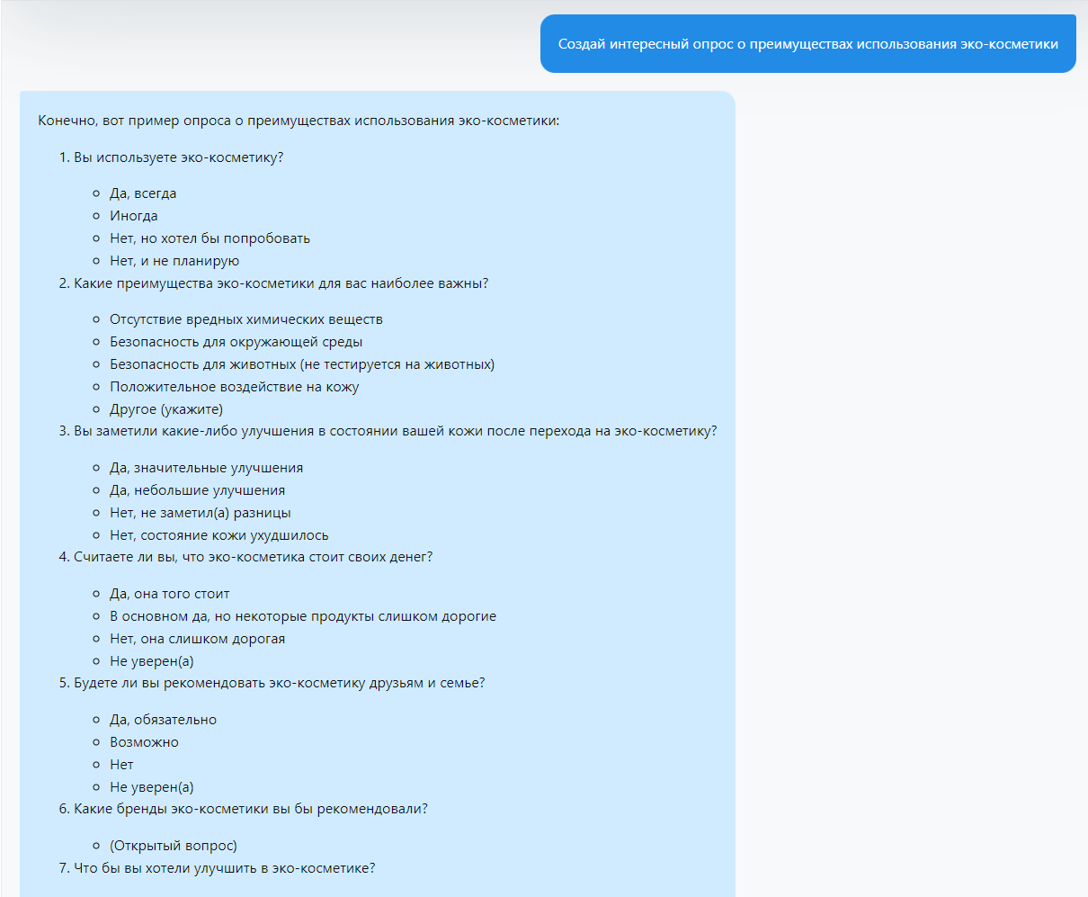 Во-первых, вы можете использовать ChatGPT для разработки многозадачных стратегий участия. Например, генерировать интересные вопросы или опросы, которые могут вызвать обсуждение и вовлечь вашу аудиторию в диалог. "Создай интересный опрос о преимуществах использования эко-косметики":