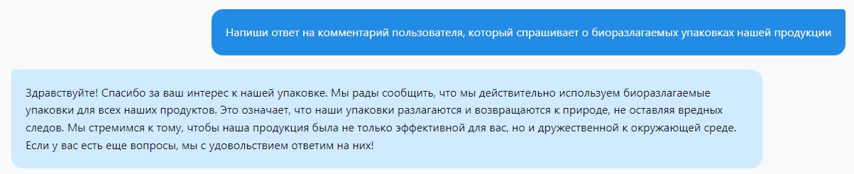 Также важно обратить внимание на то, что управление сообществом включает в себя мониторинг и ответ на комментарии под вашими постами. Хотя ChatGPT не может напрямую взаимодействовать с пользователями, он может помочь вам при подготовке ответов на типичные комментарии или вопросы. Просто представьте ситуацию и попросите помощи: "Напиши ответ на комментарий пользователя, который спрашивает о биоразлагаемых упаковках нашей продукции".