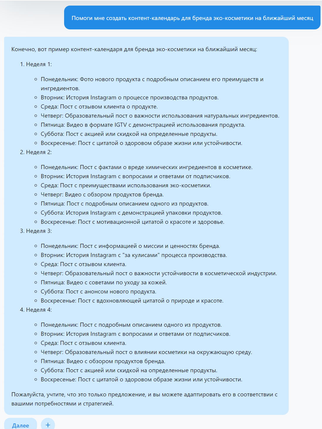 Создание контент-календаря: После определения целей, аудитории, тем и форматов контента следующим шагом будет создание контент-календаря. Это расписание, когда и что вы будете публиковать. С помощью ChatGPT вы можете создать основу для контент-календаря: "Помоги мне создать контент-календарь для бренда эко-косметики на ближайший месяц".