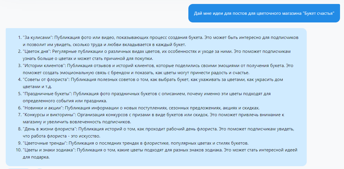 Одной из важнейших частей любой стратегии контента является постоянный поток свежих и интересных идей для постов. Вот несколько способов, как ChatGPT может помочь в этом: