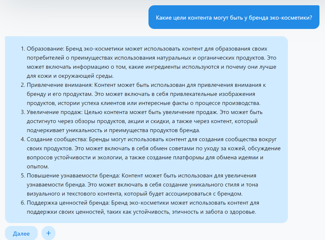 Определение целей: Первый шаг в разработке стратегии контента - это определение ваших целей. Чего вы хотите достичь с помощью своего контента? Это может быть увеличение осведомленности о бренде, привлечение новых подписчиков, продвижение продукта или услуги или создание общества вокруг вашего бренда. Можно задать ChatGPT: "Какие цели контента могут быть у бренда эко-косметики?".