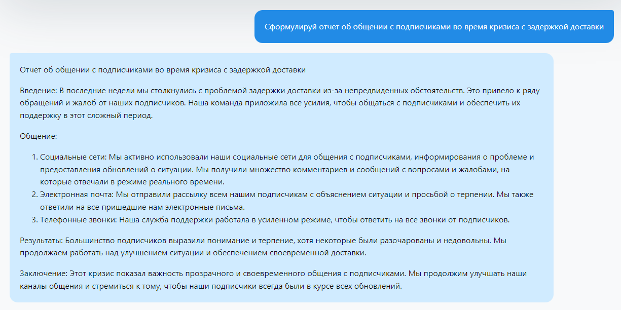 После кризиса ChatGPT может помочь вам в анализе произошедшего, помогая выявить ключевые моменты общения и возможные пути улучшения. "Сформулируй отчет об общении с подписчиками во время кризиса с задержкой доставки":