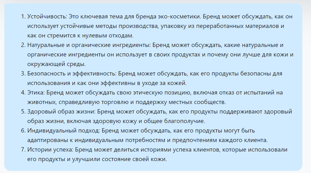 Выбор ключевых тем: Ваши ключевые темы будут определять то, о чем вы будете писать или создавать контент. Они должны отражать интересы вашей аудитории и быть связаны с вашим брендом или продуктом. Запросите у ChatGPT: "Какие ключевые темы могут быть для бренда эко-косметики?".