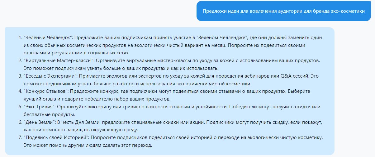 Создание идей для вовлечения аудитории: Вовлечение аудитории является ключевым фактором успешности в социальных сетях. Это может быть в форме викторин, опросов, конкурсов или челленджей. ChatGPT может помочь сгенерировать такие идеи: "Предложи идеи для вовлечения аудитории для бренда эко-косметики"