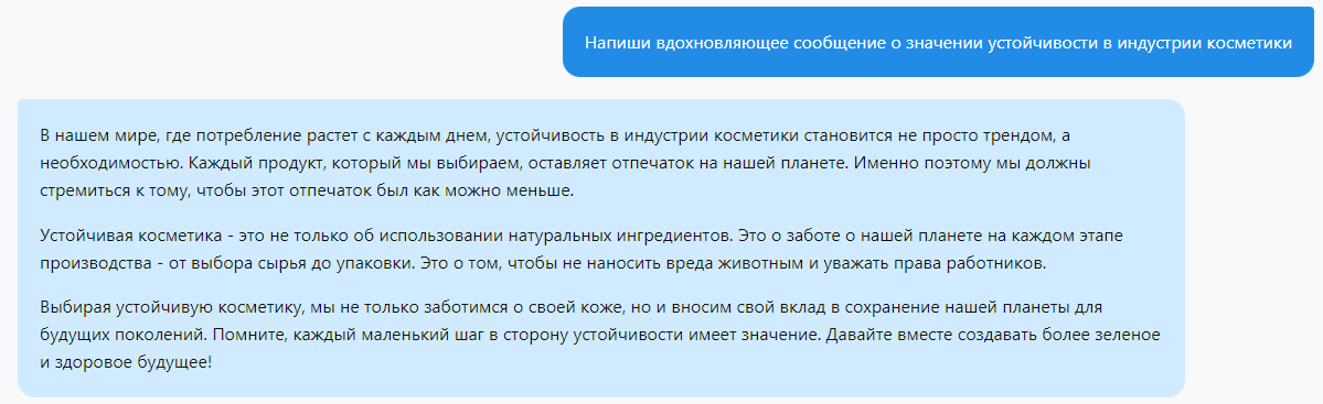 Во-вторых, вы можете использовать ChatGPT для создания текстов сообщений, которые помогут установить более глубокое и персональное взаимодействие с вашей аудиторией. Сообщения, которые демонстрируют ценности вашего бренда или подчеркивают вашу миссию, могут сильно укрепить связь с вашим сообществом. Например, "Напиши вдохновляющее сообщение о значении устойчивости в индустрии косметики":