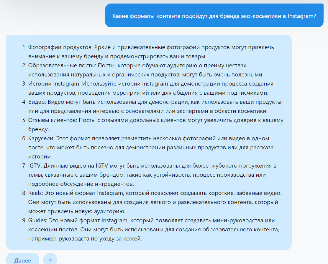 Выбор форматов контента: В социальных сетях существует множество форматов контента, включая текстовые посты, изображения, видео, stories, reels и т.д. Ваш выбор формата зависит от предпочтений вашей аудитории и от того, какой формат наиболее подходит для передачи вашего сообщения. Попросите ChatGPT предложить форматы контента: "Какие форматы контента подойдут для бренда эко-косметики в Instagram?".