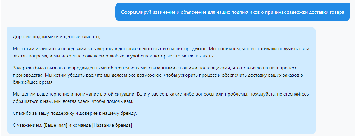 Во время кризиса, когда требуется быстрый и точный ответ, ChatGPT может помочь сформулировать четкие и конструктивные сообщения. Будь то объяснение сложного вопроса, извинение или информирование о дальнейших шагах, ChatGPT может быть полезен. "Сформулируй извинение и объяснение для наших подписчиков о причинах задержки доставки товара":